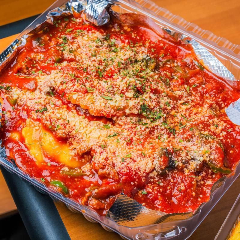 Marinara sauce over baked chicken, melted mozzarella cheese, lettuce, pickles, and tomatoes | Served on soft roll with pesto.