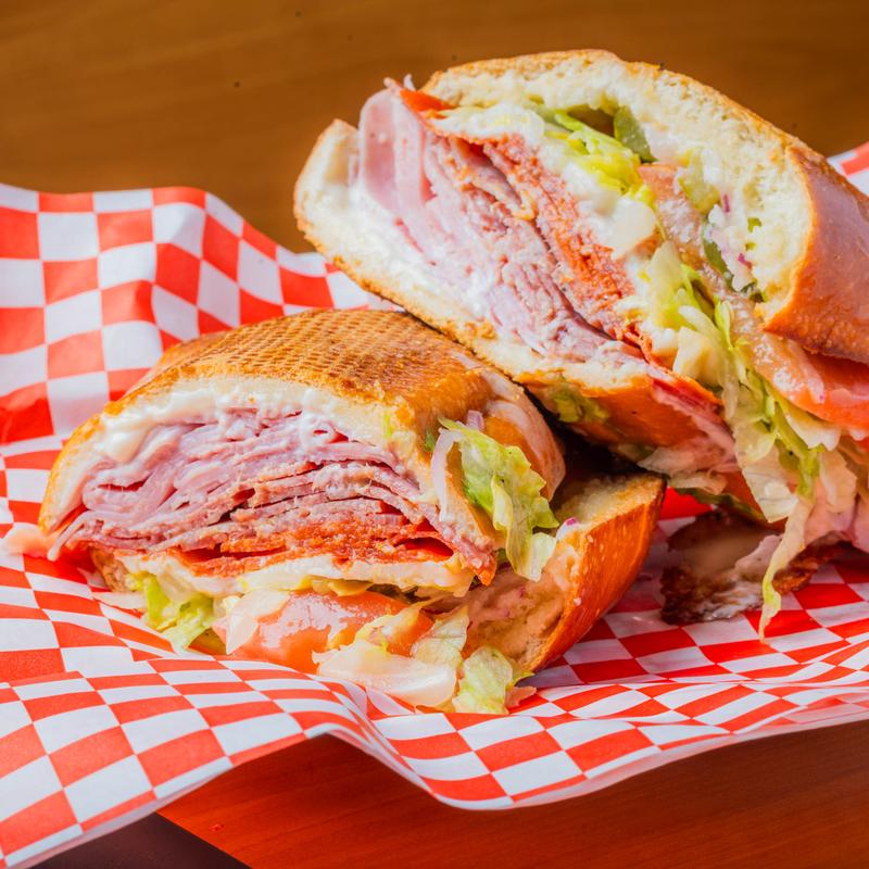 Salami, roast beef, turkey, ham, pepper jack cheese | Served on a soft roll with mayo, mustard, lettuce, tomatoes, pickles, onion, jalapeño, and black olives.