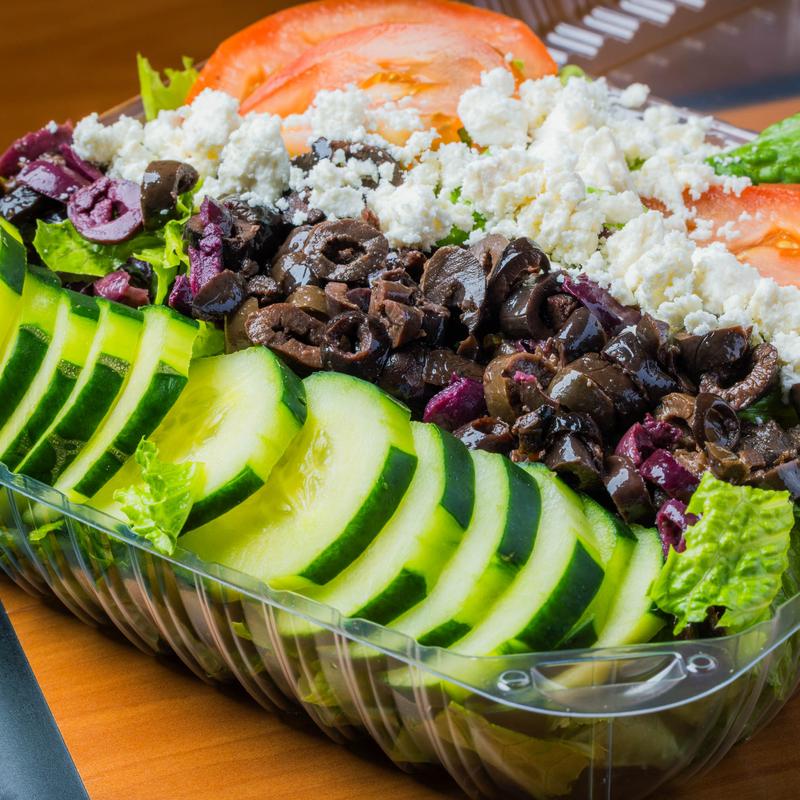 Romaine lettuce, tomatoes, onions, bell peppers, cucumbers, salami, pepperoni, Canadian bacon, and mozzarella cheese.